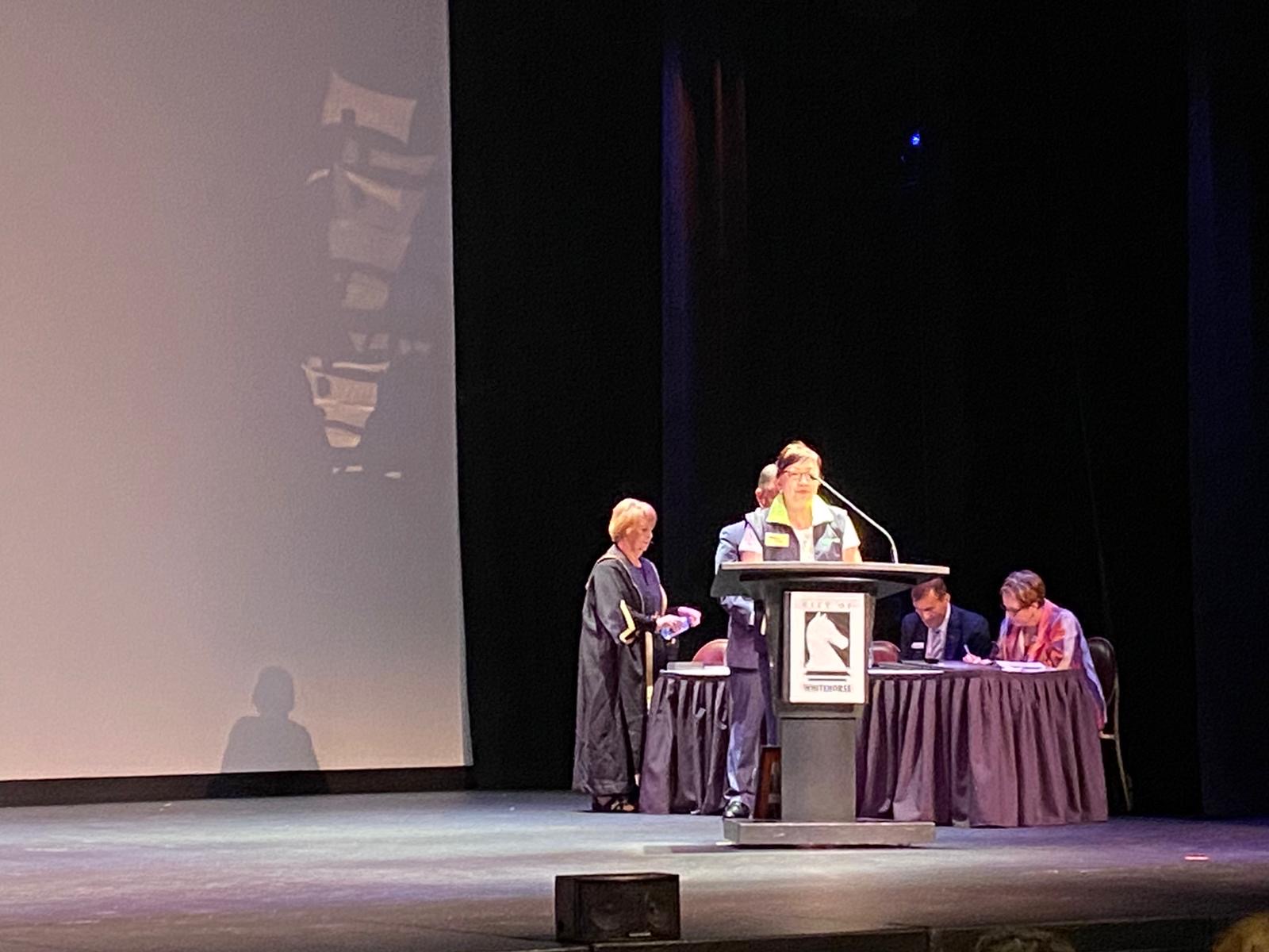 在领奖台上Rufina 会长发表了重要的讲话,她对所有的成员的付出表示很深的感谢,同时也感谢白马市政府能够给予我们团队这份荣誉,更感謝我们的提名市议员Cr Anna Chen, 參考人 Cr Tina Liu 及前巿长Jennifer Yang 的支持,未来我们也将继续努力,更好的为社区服务。现场响起了阵阵掌声。