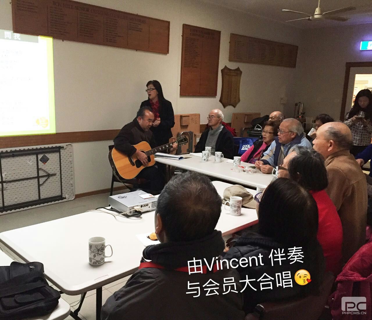 講座結束後,請到援風會顧問,前華聨㑹主席Vincent 彈吉他帶領會員們唱懷舊金曲,共用歡樂氛圍,氣氛相當融洽,大家都滿懷笑容,相當喜歡當天活動。 活動中會員們開心投入,享受陽光團隊為他們準備的每個環節中,活動在依依不捨的氣氛中緩緩結束 。