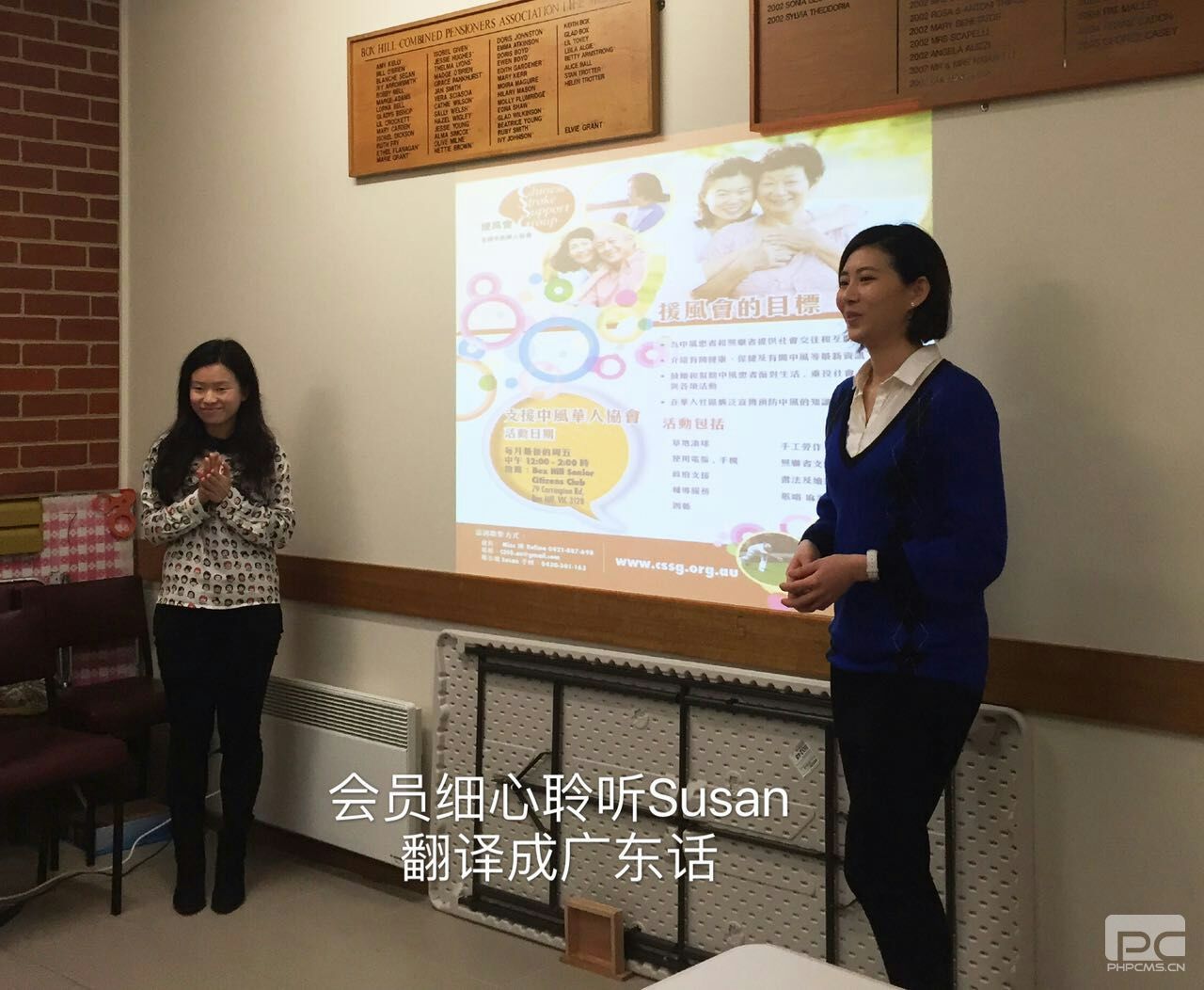 2016年的7月29日週五,迎來了援風㑹 「支援中風華人協會」 七月例會活動,主題為”養生,防中風及護理常識+大家一起唱民歌」,邀請到曾擔任台灣醫學中心神經外科的資深護理師,同時也是澳洲營養健康協會營養顧問的張湘蓓女士, 與會員及照顧者分享有關中風後照護之相關資訊,並由陽光團隊Susan擔任廣東話翻譯。 過程中互動頻繁,專業又不失風趣,結束時在場多位會員及照顧者主動提問問題並得到解答,表示收穫良多。