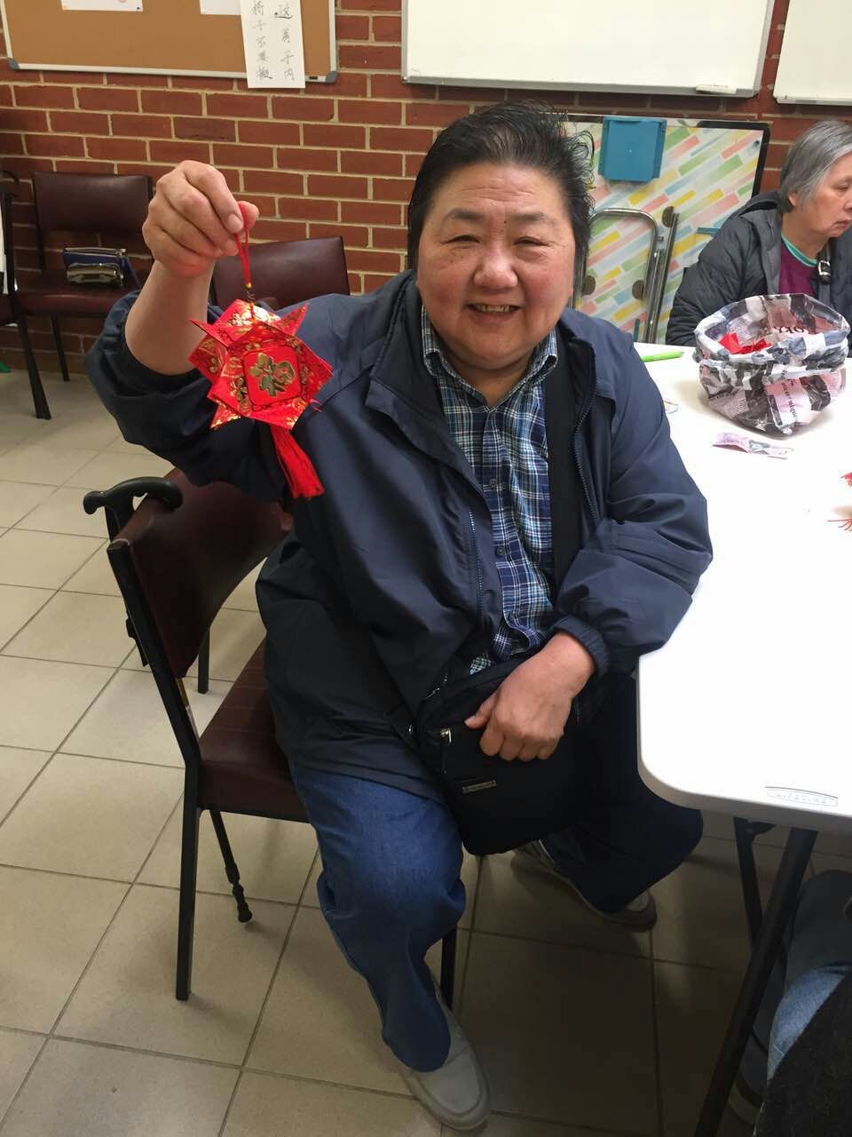 後半部份, 中秋佳節剛過, 陽光團隊教導與協助會員及家屬製作手工燈籠, 以幫助手部和眼部運動, 會員及家屬們可彼此溝通及鼓勵, 最後完成 “福燈籠” 作品帶回家做紀念, 共用歡樂氛圍, 氣氛相當融洽, 大家都滿懷笑容, 相當喜歡當天活動。